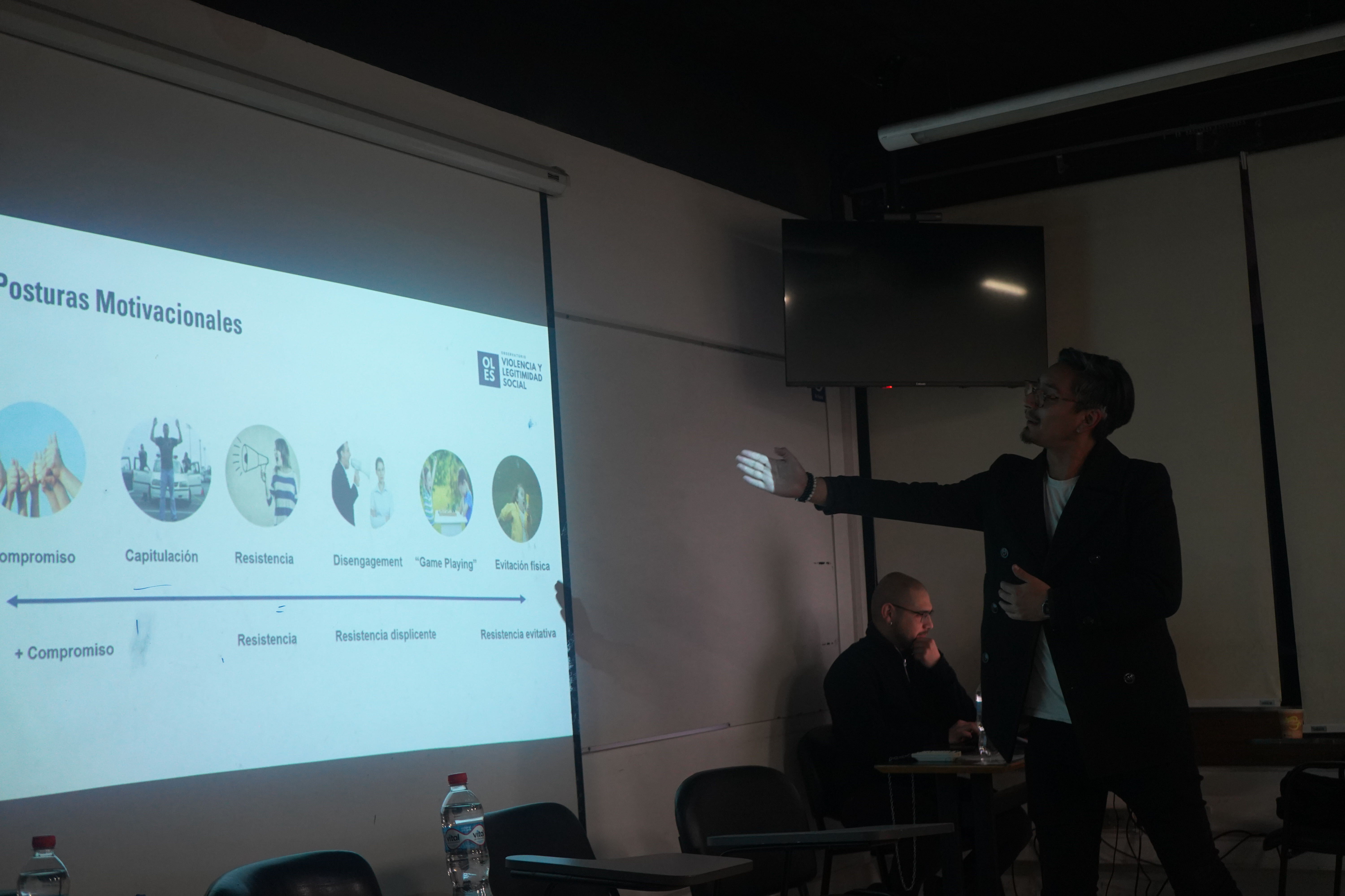 Finalmente, el investigador Luciano Sáez (Ciencia Sociales, UDP) presentó una investigación sobre una aplicación de la teoría de las posturas motivacionales en la relación entre carabineros y ciudadanía desde un punto de vista cualitativo. Trabajo que nos permitió conocer las relaciones de distancia y cercanía que la ciudadanía moviliza en su relación con las policías.