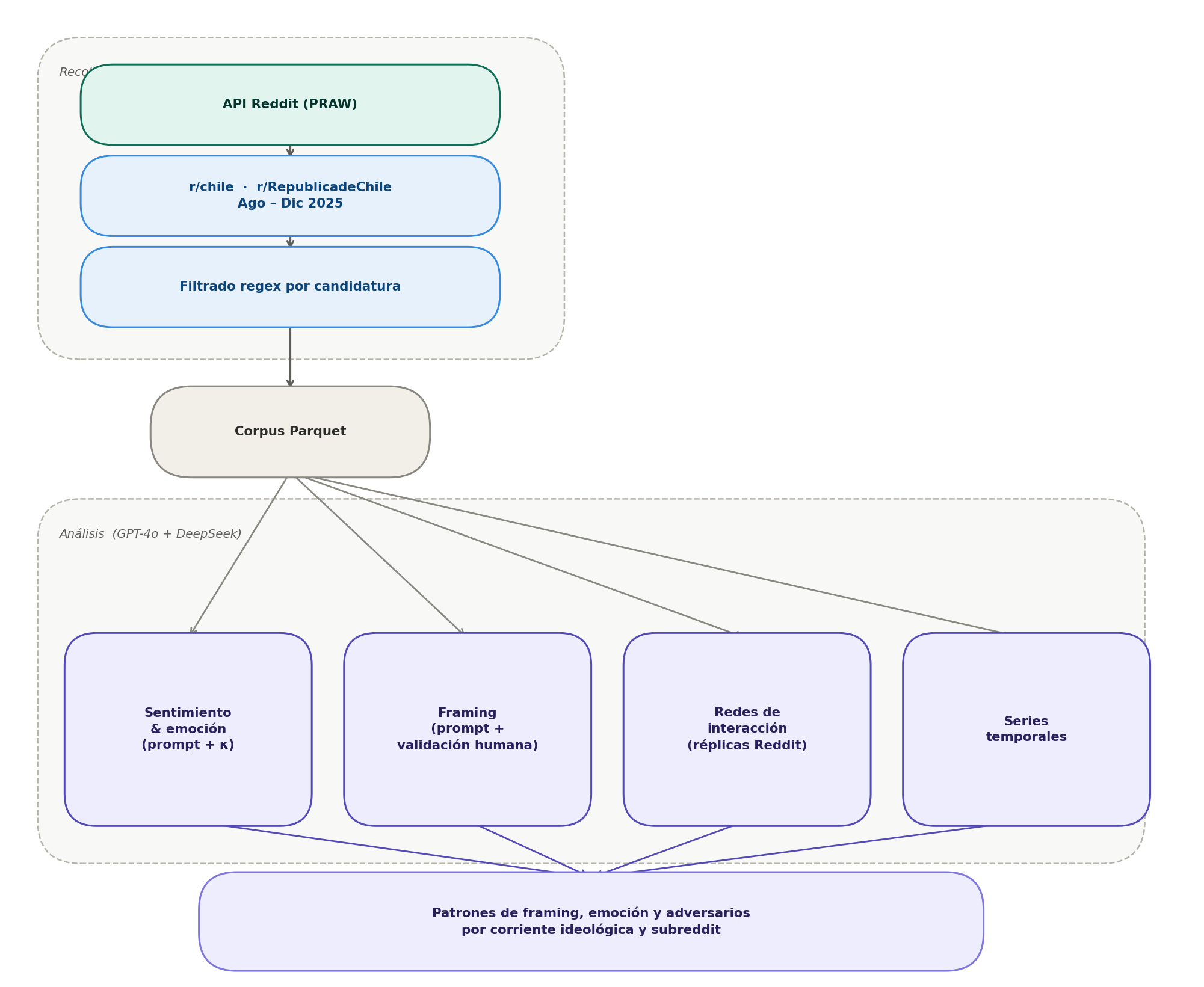 Al cierre de la recolección (31 de diciembre de 2025), el corpus contiene todos los posts y sus árboles completos de comentarios publicados en r/chile y r/RepublicadeChile durante el período que mencionan al menos una de las cuatro candidaturas de interés, junto con sus metadatos asociados. La estructura del corpus permite análisis longitudinales, de red e interaccionales a lo largo del ciclo electoral completo.